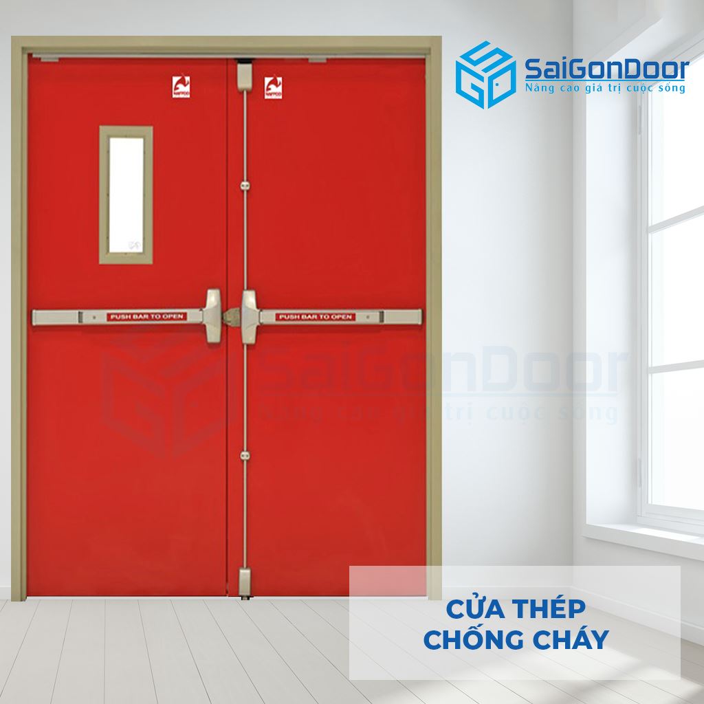 - Ngoài ra, bản lề cối và thanh thoát hiểm bằng inox cao cấp sẽ tạo nên cánh cửa chống cháy hoàn chỉnh, tạo độ vững chắc cho cửa, giúp cửa bám chắc vào khung và không bị ảnh hưởng khi có sự cố xảy ra